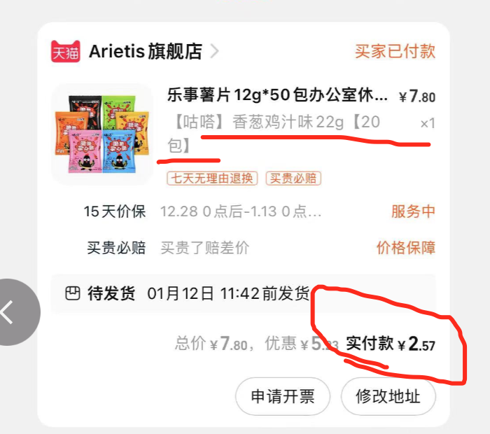 特别注意下,我选的这个干脆面,20包本来7块多,德清券抵扣后是2块多。